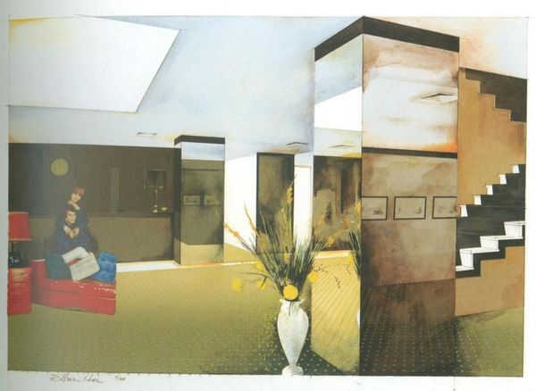 Curator: Looking at this photograph, "Untitled (interior with blue carpeting)" by Del Carlo Studio, I immediately feel a pang of nostalgia, a longing for a time I never knew. Editor: Yes, the composition is striking, but it also speaks to the commodification of domestic space and the subtle politics embedded within interior design. The woman in the distance is almost like a phantom. Curator: I find the color palette fascinating! The cool blues of the carpet contrast with the warm wood tones, creating a tension that's both inviting and slightly unsettling. It feels like a stage set. Editor: That's interesting, because the choice of including the woman on the balcony implies a narrative about women’s confinement and freedom, gazing out but still trapped inside. Curator: Perhaps the artist is hinting at the complexities of home, how it can be both a sanctuary and a cage. Editor: Exactly. It also invites us to question the ideals of domesticity and to consider who is excluded from the fantasy of home. Curator: Ultimately, this seemingly simple interior scene becomes a powerful reflection on identity, belonging, and the spaces we inhabit. Editor: Indeed, it’s a poignant commentary on the stories our homes tell, intentionally or not.