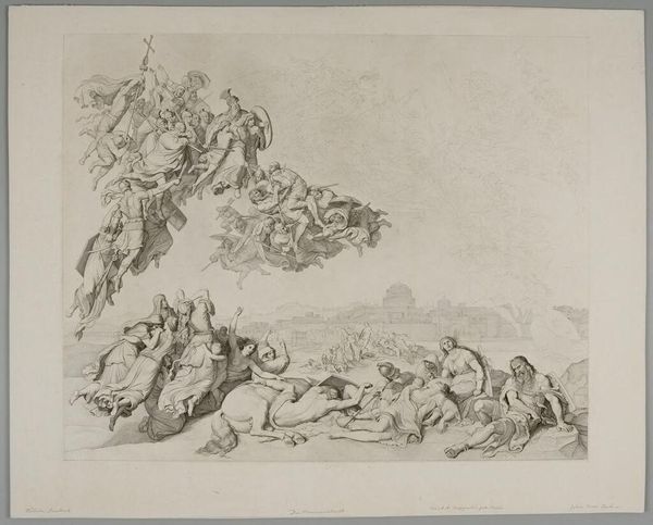 Editor: So, this drawing is “The Damage of Sennaherib” by Peter Paul Rubens, from 1618, done in pencil. It’s chaotic, full of figures and horses, all rendered with such energetic lines. What strikes me most is the sense of violent movement...almost a collapse. How do you interpret this work? Curator: It's fascinating how Rubens condenses such a complex biblical narrative into a single image, isn’t it? The story comes from the Old Testament. Sennaherib, the Assyrian king, threatened Jerusalem, but an angel of the Lord brought plague upon his army. The symbolism here is quite potent. Look at the angel descending from above. Editor: Yes, there's a figure floating amidst the tumult...almost as if the energy of the whole piece is directed towards them. Curator: Exactly. And what does the downward motion, almost a swooping dive, suggest to you in terms of symbolic representation? It speaks to divine intervention. Rubens uses the angel not just as a figure, but as a signifier of a much larger, unseen force. Editor: I guess it’s like this one moment representing the entire, almost instantaneous destruction of the army? A visual shorthand. Are there other symbols I should notice? Curator: Consider the prone bodies beneath the horses. These aren't just fallen soldiers; they represent the sudden and total reversal of fortune. A powerful image carrying the weight of cultural memory - the consequences of opposing the divine. See the flag? This represents earthly powerlessness against the divine. Editor: This really deepens my understanding. It’s not just a battle scene; it's a representation of a divine power punishing arrogance. Curator: Precisely. And understanding the symbolism is key to unlocking the emotional and psychological depth of the image for Rubens.