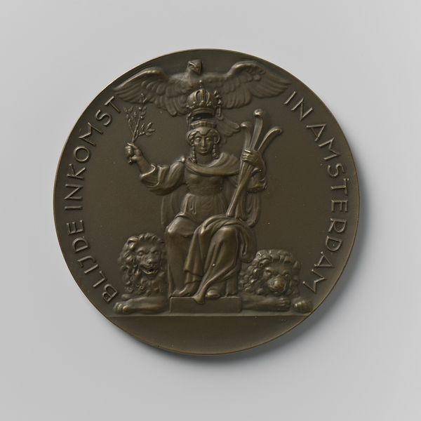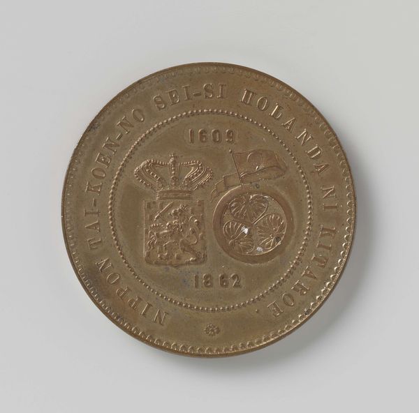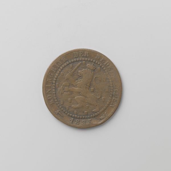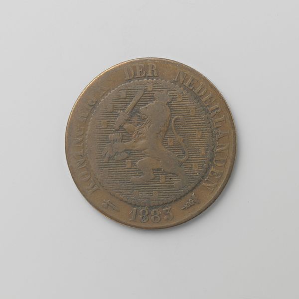 This is a two-and-a-half cent coin, made of bronze in the Netherlands in 1886, during the reign of King Willem III. Coins like this one were produced through industrial processes, involving die-stamping and mass production. The bronze material, though common, was carefully selected for its durability and association with value. The coin’s design, featuring a lion and inscriptions, was meticulously engraved into the die, showcasing skilled craftsmanship adapted to mechanical reproduction. The coin is more than just currency; it is a symbol of Dutch identity and economic power during the late 19th century. Its creation reflects the complex relationship between artistry, industrialization, and national identity. It challenges traditional distinctions between craft and industrial production, highlighting the artistry embedded even in everyday objects. The coin encapsulates a time of industrial expansion, labor, and the rise of consumer culture. Considering the materials, making, and context of such items allows a deeper understanding of their historical significance.