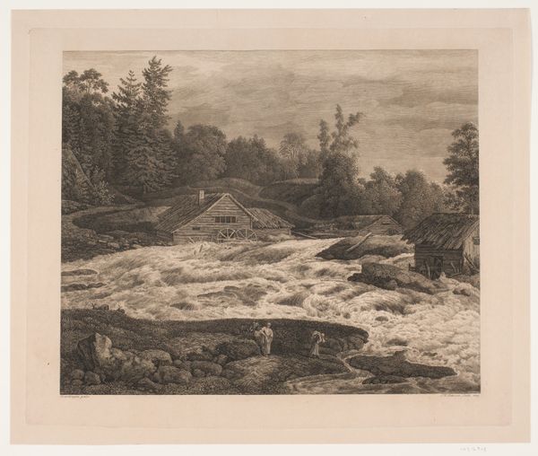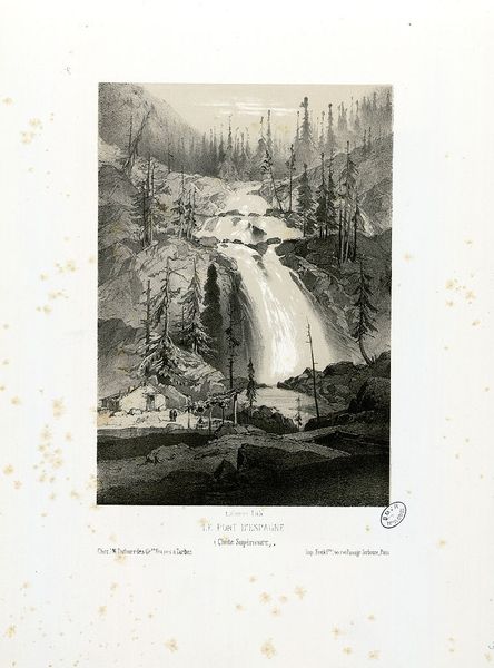 Editor: Here we have Alexandre Calame’s “Bergbeek in de Hautes-Alpes,” created between 1842 and 1863, using pencil, watercolor, tempera, drawing, and etching. The roaring water gives a palpable sense of nature's power. What do you see in this piece? Curator: I see the embodiment of the sublime, the romantic ideal of nature as both awe-inspiring and terrifying. The cascading water, almost overwhelming in its energy, echoes the psychological turbulence explored by Romantic artists. Consider how the mountain, shrouded in mist, serves as a recurring symbol of transcendence. Do you notice the sharp contrast between the untamed torrent and the stoic rocks? Editor: Yes, the rocks provide a solid grounding amidst all the movement. It seems intentional, as if representing stability in a changing world. Curator: Precisely. That interplay speaks volumes. Think of how water often signifies purification, the cyclical nature of life, whereas rocks often symbolize enduring strength and time, which brings forth questions of existential concerns about humanity's place within it all. Also, what of the forest receding in the distance? It seems to hint at mystery, an unknown just beyond our grasp. Editor: I hadn't considered the forest in that way, but it makes perfect sense given the other symbolism present. Curator: This era yearned to connect to nature, viewing it as an untainted source of spiritual truth. Editor: It's fascinating how many layers of meaning can be found in what appears to be a simple landscape. Curator: Indeed! Calame invites us to delve deeper into our understanding of cultural memory tied to visual symbols. It reminds me of our place in time and our responsibility toward nature's bounty. Editor: Thanks for sharing those insights. It’s been very insightful.