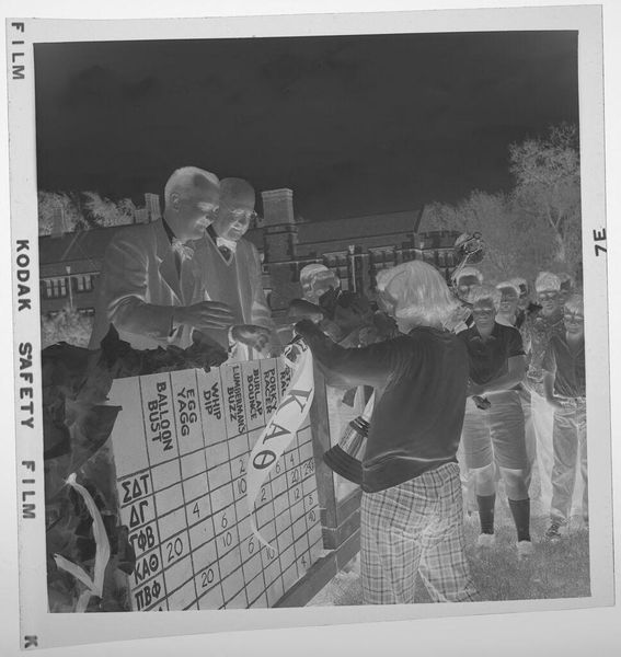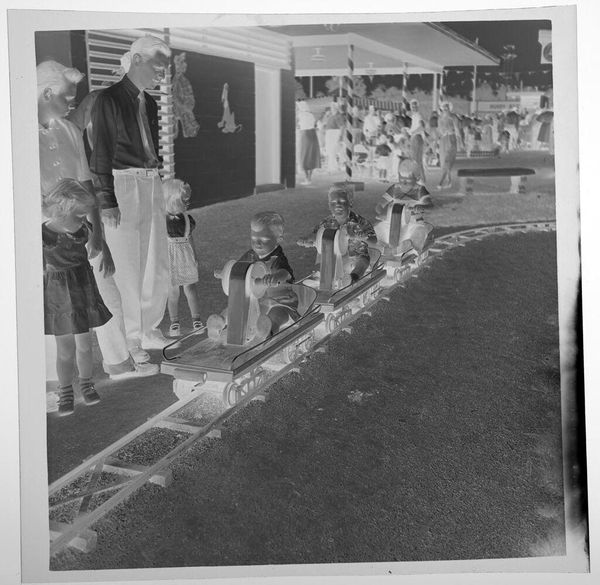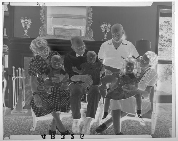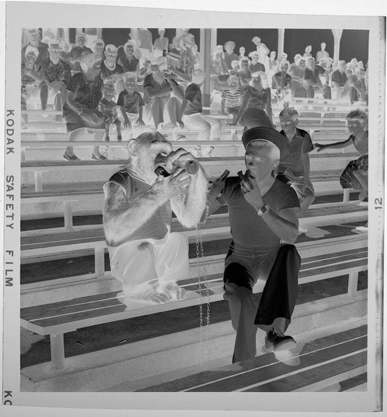 Curator: This is an "Untitled" photograph by Jack Gould, currently held in the Harvard Art Museums. It depicts a man and a chimpanzee on bleachers, oddly captivating and unsettling all at once. Editor: It’s certainly an interesting image; the textures seem so tactile, almost like I could reach out and touch the weathered wood of the bleachers. The negative print gives it a ghostly quality. Curator: Given the figures' attire, this image likely plays with gender roles and stereotypes of masculinity in the mid-20th century. The sailor, the chimpanzee—both are loaded with cultural baggage. It makes you wonder about representation. Editor: Absolutely, and the labor behind capturing this image is worth exploring. It's not just about pointing and shooting; it's about the film, the developing process, and the choices made in printing. Curator: I agree completely. Considering the power dynamics inherent in staging such a scene—the human’s dominance, the animal’s potential exploitation—is crucial for a modern understanding. Editor: Right. And that bottle near the man's feet! Washed up there or put there? Anyway, this makes you think about the photographer’s intention. Curator: Exactly. Both the sailor and the chimp are reduced to objects, really. This image brings up complex questions about the gaze and our own complicity. Editor: Seeing it this way changes the piece.