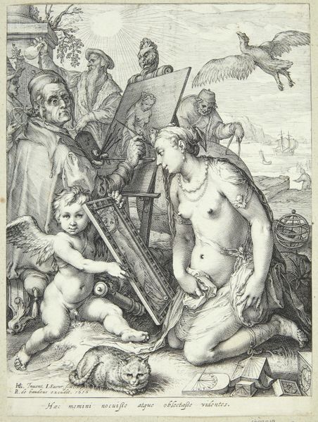 Hendrick Goltzius created this engraving called “Oefening en Kunst,” or “Practice and Art” sometime in the late 16th century. It allegorically depicts the relationship between artistic theory and practical skill. We see a winged, nude figure of Art, who represents the artist's inspiration. She sits on a globe, symbolizing the broad scope of artistic knowledge. Beside her, Use, or practice, is represented by an older, clothed man diligently working at a tablet. The image highlights the tension between divine inspiration and the mundane reality of labor. This was a period of intense intellectual and artistic exchange in the Netherlands, with printmaking as a key medium. Goltzius was a leading figure in the Haarlem Mannerist school, but here he questions the period’s emphasis on elaborate stylization. He implies that true artistic achievement requires not just theoretical knowledge but the hard work of practice. To understand this image fully, a historian might look into the culture of artistic training in the Netherlands and the debates around artistic style. Art is never created in a vacuum, and Goltzius’ work shows us that it is always rooted in a specific social and intellectual context.