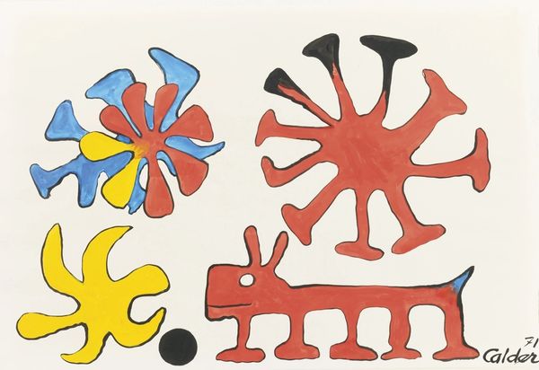 Alexander Calder made this painting, Cog Wheels, with paint on paper, and what strikes me is how he’s embracing the pure joy of artmaking as a process. The surface is alive with these bright, unmodulated colors—red, yellow, blue—laid down with an immediacy that's totally disarming. It’s like he's saying, "Here's color, here's form, let's not overthink it." The shapes, like playful, oversized amoebas, are outlined in black, giving them a graphic punch, a kind of visual oomph. I love the way the yellow one overlaps the blue, creating this kind of dynamic tension that makes the whole image vibrate. The materiality of the paint is so straightforward, so unpretentious. You can see the brushstrokes, the way the pigment sits on the paper, not trying to be anything it isn't. Calder reminds me of Miró, both sharing a language of signs, a love of play, and a willingness to let the hand lead the way, reminding us that art is, above all, a conversation, a back-and-forth, and open to endless possibilities.