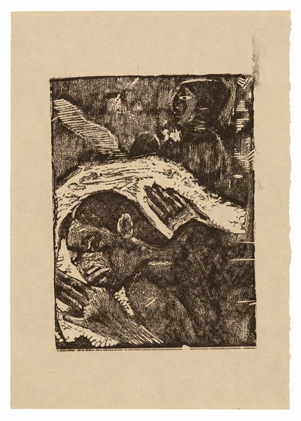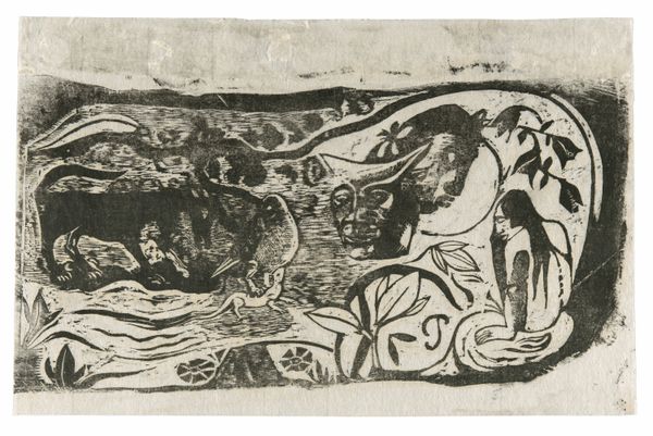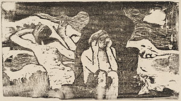 Editor: This is Paul Gauguin’s "At the Black Rocks" from his Suite of Late Wood-Block Prints, made around 1898-99. It’s a woodcut on paper, and the stark contrast really draws me in. What can you tell me about it? Curator: It’s compelling, isn’t it? Consider the labor involved in producing a woodcut at the turn of the century. The physical act of carving the block, the repetitive printing process—these speak volumes about the value Gauguin placed on craft. What do you make of his choice of this medium? Editor: I see it as…intentional. It wasn't the quickest way to reproduce images, surely? Curator: Exactly! And who was he printing these for? The "Suite of Late Wood-Block Prints" was intended for a select audience, and it really contrasts the accessibility of something like mass-produced lithographs. Gauguin elevates this traditionally folk medium, blurring the lines between "high" art and craft. What does the materiality – the texture and rawness – communicate to you? Editor: It almost feels…primitive? Like he’s trying to connect with something elemental, unrefined. Was that common then? Curator: Precisely. Consider also his context. He lived and worked far away from European urban centers. The act of creation and the distribution are a part of how this should be assessed as it reflects Gauguin's position relative to dominant art markets. Does the print change meaning once it goes from point A to point B? How might it be perceived and understood by different social actors? Editor: That makes so much sense! I never thought about how the printing process itself could be so meaningful. Thanks, that really opened my eyes. Curator: It’s about understanding the journey of the artwork, from its creation to its consumption. Considering process, material and social factors opens avenues into so much rich territory!