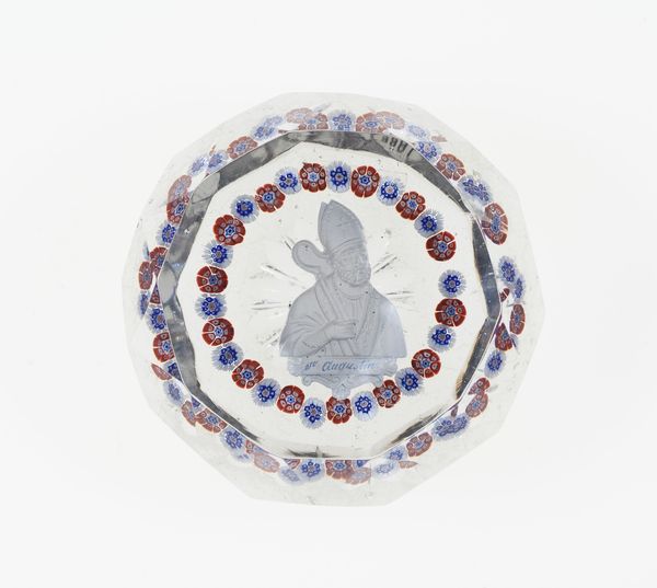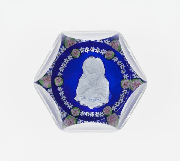 This paperweight was crafted at the Baccarat Glassworks, and its clear glass immediately draws you in. Notice how the composition focuses on a central portrait, encased in a circular form, which creates a sense of depth and containment. The portrait, rendered in cool tones, contrasts with the warm red and white stripes encircling it. This juxtaposition of colors and forms creates a dynamic tension within the piece. The stripes are like little windows around the centre. It challenges conventional portraiture by embedding it within a functional object, disrupting traditional categories of art and craft. This paperweight prompts a reconsideration of how meaning is constructed through visual elements and material choices, inviting us to explore the interplay between form and function. Its structure destabilizes fixed meanings, encouraging ongoing interpretation.