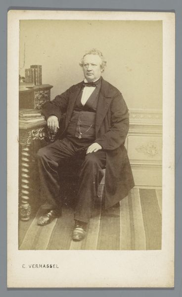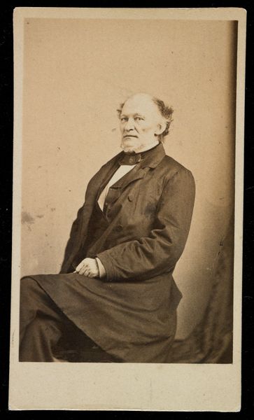 Curator: Here we have a gelatin silver print titled "Portret van Johannes Gerhardus Rijk Acquoy" created between 1880 and 1896 by Jan Goedeljee. What strikes you first about it? Editor: The immediate feeling is one of quiet dignity, bordering almost on melancholy. The sepia tones and oval frame add to this sense of faded grandeur. Curator: The artist has framed Acquoy’s face within an oval, creating a self-contained field. This draws the eye immediately to the portrait's subject, emphasizing his gaze and the formal qualities of his expression. The light and shadow play on the surface add depth and interest. Editor: It’s interesting how photography, even in its infancy, attempts to capture more than just likeness. There is such calculated use of symbolism. Acquoy’s dark suit, crisp white shirt, and carefully groomed hair speak to his societal position. The high collar, almost clerical, gives me the sense he could be an academic, possibly a man of faith. Curator: I agree that sartorial semiotics are essential in understanding his portrayed character, though it is the artist Goedeljee’s manipulation of tone that evokes that effect, and a stark line from dark jacket, to crisp linen, to carefully cultivated beard. Editor: Right, the symbolic power of monochrome. Despite the color constraints, the light etches a remarkable definition on Acquoy’s features. In a way, color would prove a distraction from the austere message: a respectable figure caught in quiet reflection. Curator: And within that definition of line and contour is a depth that offers almost infinite entry-points of interpretive potential, where we may spend countless moments mining details. Editor: Precisely. Looking at it now, it feels like more than just a picture; it’s an echo of a life, mediated through the formal elements of visual presentation, and the enduring visual symbols. Curator: A poignant encounter, rendered in silver halide. Editor: Yes, a silent conversation across time, framed by the subtle power of images.