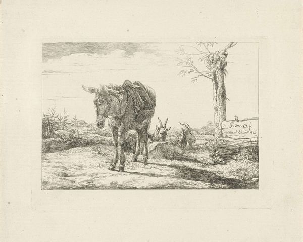 Curator: We’re looking at Reinier Vinkeles's 1762 engraving, “Geit zoogt haar jong,” which translates to “Goat Nursing Her Young.” Editor: My first impression is one of calm, almost pastoral. The delicate lines and shading give it a quiet, intimate feeling. There's a sense of immediacy in the rendering of light. Curator: The scene depicts a mother goat attentively nursing her kid, and you can make out another goat resting in the background. What might such a simple genre scene tell us about the values of the time? Editor: The emphasis on detail – look at the texture of the goat’s hair, achieved solely through line work, it’s quite impressive. And then you notice that delicate background treatment; that use of space directs our attention. It is meticulously constructed. Curator: Beyond the surface-level scene, there’s a universal symbolism present. The image is a potent symbol of maternal love, fertility, and nourishment – values that resonate throughout cultures and across centuries. Even in the seemingly simple act of a mother feeding her child, Vinkeles connects us to timeless themes of care and nurture. Consider too the wider symbolic history of the goat: its associations with pastoral innocence on one hand, and pagan ritual on the other. Editor: You make an interesting point. I was focusing more on the visual strategies, the lines creating form and space, the subtle tonal variations...But seeing the underlying symbolic associations of this very humble presentation— the goats acting as the perfect vehicle to carry them is enlightening. Curator: Precisely! Vinkeles invites us to find meaning in the everyday. Editor: I suppose, beyond the formal qualities, I can appreciate the narrative it quietly unfolds: family, care, the gentle cycle of life depicted. It humanizes. Curator: It’s interesting how different readings can coexist, both the structural elements and the cultural resonance you mention. Editor: Agreed. There's definitely more than initially meets the eye. Thank you!