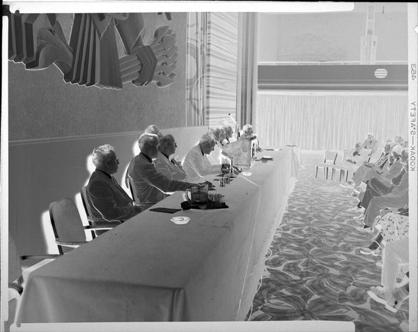 Curator: Martin Schweig’s “Untitled (elevated view of dining tables in banquet room)” presents us with a black and white photograph capturing a meticulously arranged banquet setting. Editor: It feels almost ghostly, doesn't it? Like stepping into a memory of a grand event, heavy with anticipation. Curator: Precisely! This image likely captures a moment before an event, ripe with potential social interactions. Notice the rows of empty tables, each meticulously set, reflecting the socio-economic structures of the time. Editor: The repetition of the tables, the chairs, even the place settings, creates a powerful visual rhythm. It almost feels ritualistic – a space prepared for a significant gathering. I wonder what symbolic meanings were intended to convey. Curator: A fascinating question. The lack of people allows the architecture and design elements to convey a sense of formality and power, typical of spaces designed for social gatherings and displays of wealth. Editor: Yes, the image seems laden with the weight of expectations and the unspoken codes of social conduct. It invites contemplation on the ephemeral nature of such gatherings and their lingering impact on our cultural memory. Curator: Indeed. Schweig’s photograph offers a glimpse into the structured environments that shape our interactions. Editor: And reminds us of the complex symbolism inherent in even the most mundane of settings.