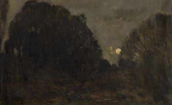 Editor: This is "At Sundown," painted in 1889 by Arthur Hawksley, and it seems to be an oil painting. The mood is quite somber, almost melancholic, with that dense, shadowy foliage. I am struck by the way the buildings and nature seem to meld. How do you interpret this work? Curator: It's a funny little world Hawksley pulls us into, isn’t it? It feels so heavy with atmosphere, that amber gloom. The unfinished quality almost enhances that feeling, like a memory half-grasped. It’s not about capturing the scene perfectly, it's about evoking a sensation. A fading light. What do you make of that clearing or erasure to the left? Almost looks like a ghostly blob there, doesn't it? Editor: Yes, that's very noticeable! I did wonder if that area was unfinished or had been damaged, perhaps? It creates a strange focal point that kind of draws your eye away. Curator: Exactly! It introduces a delicious tension between what's present and what’s absent. Hawksley teases with absence, with that eerie blob it creates a feeling of impending dark or loss perhaps. It might be worth keeping an eye out for what else that painter has erased. It's so like a mind playing tricks on one's memory and is somehow, incredibly intimate for that fact alone! What’s *your* takeaway? Editor: I hadn't considered it that way, as intentional erasure, and it makes the image much more compelling. That melancholy I felt initially now feels more layered, a bittersweet memory perhaps. Curator: Perhaps our Hawksley created this artwork for their eyes only, a melancholic glimpse of beauty in something that fades. It becomes incredibly evocative, doesn’t it? Makes me want to wrap up in a blanket and brood a little, if I'm honest.