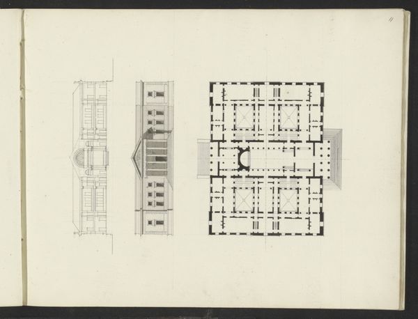 Editor: Here we have "Plattegrond van de derde verdieping van Felix Meritis te Amsterdam," a print and etching from between 1789 and 1799, by Noach van der Meer. Looking at this detailed architectural plan, I'm struck by its rigid geometry. It feels almost utopian in its precise arrangement of space. What do you see in this piece that I might be missing? Curator: Well, focusing on the historical context is key. Felix Meritis was a society dedicated to Enlightenment ideals – science, art, literature. This floorplan represents not just a building, but an architectural embodiment of those ideals. Think about the French Revolution brewing during this period. What does it mean to design such a rational, ordered space for intellectual pursuits in such a turbulent time? Editor: So the geometry isn't just aesthetic; it's political? Curator: Exactly. Neoclassicism, the artistic movement it’s associated with, with its emphasis on order and reason, was often seen as aligning with revolutionary and republican values. But also, consider who had access to this space. Who were the members of Felix Meritis? What kinds of knowledge and artistic practices were privileged within its walls? This building wasn't just a symbol of Enlightenment ideals, but also of social and intellectual hierarchies. How does knowing it might have political intention changes your first assessment? Editor: That definitely reframes it. The plan seemed so sterile at first, but knowing the social context gives it so much more depth. I hadn't considered that even a floorplan could participate in those power structures. Curator: Precisely. It makes you wonder, doesn't it, about the power of architecture to both reflect and shape society.