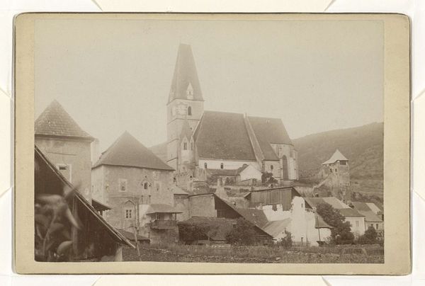 Curator: Oh, there's something deeply comforting about this old print, a photograph entitled "Straatgezicht in Bolzano, met dranklokaal Batzenhäusl", dating from somewhere between 1885 and 1889. Editor: It certainly evokes a simpler time, doesn’t it? A quiet street scene, bathed in soft light...almost feels melancholic in a way. Curator: Melancholic...yes, perhaps that's part of its allure. It's currently held at the Rijksmuseum. What strikes me is how matter-of-factly it documents daily life in Bolzano at that time. These types of city scenes became widely accessible and collectible due to advances in printmaking and the burgeoning tourist industry. Editor: Absolutely. You can practically hear the echo of horse-drawn carts on those cobblestones. Notice the almost theatrical use of light and shadow to define forms within this urban tableau. The way the light bounces from wall to wall is very satisfying. It directs the viewers to a type of pedestrian promenade. Curator: It’s remarkable, isn’t it? These city prints served a dual purpose; offering a snapshot of a place while also creating an idealised vision of what it should represent. Editor: The presence of figures, even small ones, provides a human scale amidst the architecture. Are they workers, inhabitants, or passers-by? It raises so many questions of authenticity: Who is being depicted here? And, ultimately, what function did their depictions serve? It's a carefully staged and posed street scene. Curator: Good point! Though seemingly candid, they speak volumes about the public role of photography in shaping perceptions and reinforcing cultural narratives around an idyllic region. It is what this print makes you contemplate on a personal level, with all its intricacies and odd perspectives. I love this photograph even more for the discussion we have had, and where it is heading. Editor: Indeed. Art is always made better by the discussion that grows around it. It starts us off on fresh pathways of comprehension that can both validate and deepen our unique perceptions of our public role in understanding it all.