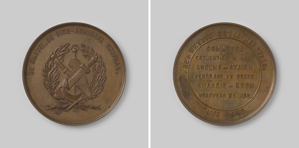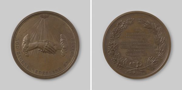 This bronze medal, created in 1864 by an anonymous artist, celebrates the 25th anniversary of the "Overeenstemming uit Kunstgevoel" music society in Schiedam. Note the radiant star above the instruments, a motif deeply rooted in iconographic tradition. The star, often symbolizing divine guidance or inspiration, casts its light upon the musical instruments, thus elevating the earthly practice of music to a spiritually enlightened endeavor. This motif, reminiscent of the Star of Bethlehem guiding the Magi, suggests that music, like faith, can lead to profound understanding and harmony. Consider how, even in secular contexts, symbols retain their power to evoke deep emotional responses, tapping into a collective subconscious. Here, the star invites us to contemplate music's transcendent qualities, its ability to resonate with our innermost selves and connect us to something greater than ourselves. These symbols persist, their meanings evolving, yet their emotional resonance enduring.