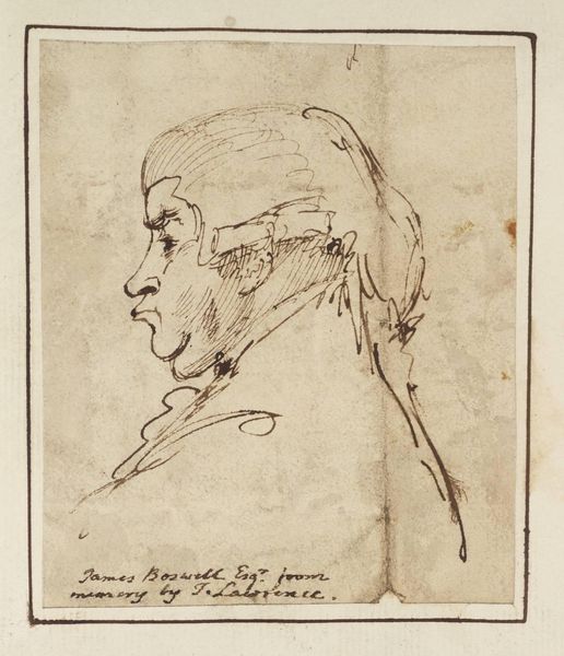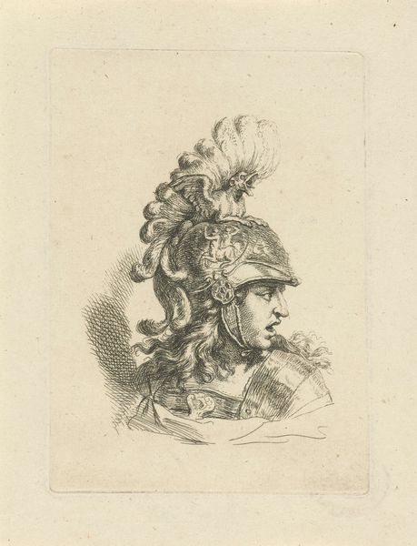 Charles Parrocel made this drawing titled, *Study of a Head*, using chalk, sometime before 1752. Immediately, your eye is drawn to the man's profile, sharply outlined against the muted ground. Notice the vigorous strokes that give volume to the face and the elaborate hat; the artist uses line and shading to model form. The drawing balances precise detail with loose, expressive marks. The subject's features are carefully rendered, especially around the eye and ear, while the hat and hair dissolve into a flurry of chalk lines. Parrocel explores the texture and structure of surfaces through contrasting strokes. This tension reflects broader artistic debates of the time, between precise academic style and the burgeoning Rococo's emphasis on movement and freedom. Consider how Parrocel uses color sparingly to animate the study. Touches of red in the face and hat provide warmth. This work engages with our perception, suggesting the dynamic interplay between form and dissolution, control and spontaneity.