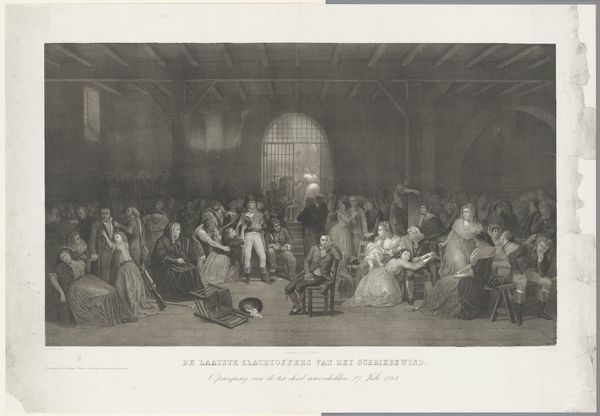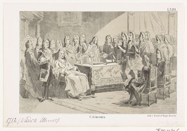 Curator: At first glance, I am struck by the solemnity of this scene, despite its crowded composition. The dramatic lighting, contrasting darks and highlights, adds a layer of tension and emotional weight. Editor: You are speaking of "Pilgrim Fathers op een bijeenkomst in Noord-Amerika, 21 januari 1621". August Allebé created this engraving sometime between 1857 and 1878. The fine, precise lines that comprise the engraving offer detail and tonality. I find it intriguing how a relatively inexpensive print medium serves to communicate the arrival of a class of immigrants. It brings into question accessibility versus social standing and visibility. Curator: A fascinating tension, certainly! Observe how Allebé arranges the figures within the composition to guide our eye. The minister stands centrally, illuminated, becoming the focal point, with the other figures framing his spiritual authority. His open gesture invites attention and also offers inclusion of those willing to partake. It becomes visually apparent how the other figures are aligned for inclusion, and how their expressions convey devotion, and their solemn presence reinforces the significance of the assembly. Editor: Consider how the scene and the medium would have circulated, most probably as a middle-class commodity, creating and feeding into ideas about American heritage. The material limitations of print – the gradations achievable, the potential for mass production – shapes the story that is told, placing emphasis on specific emotional and moral content, instead of all others. Curator: True. Although, despite being a reproductive medium, there's a distinct artistic style and arrangement—observe the academic realism employed here. Note the treatment of light, how it sculpts the figures. The visual realism offers a compelling visual narrative of community and resolve, one in tension with what appears as an impoverished materiality. The image speaks volumes through its considered organization. Editor: Absolutely. The production of the engraving itself could tell its own parallel narrative of artistry and labor, distribution networks, the engraver's access to the historical source material. Each element reveals something of Allebé's social, and potentially even economic standing. The history isn't only in the depicted scene; it's embedded in the artwork's own journey and how it reaches an audience. Curator: A compelling argument to consider both form and context, offering different perspectives on such visual storytelling. Editor: Precisely; acknowledging the making broadens and potentially disrupts interpretations of a collective past.