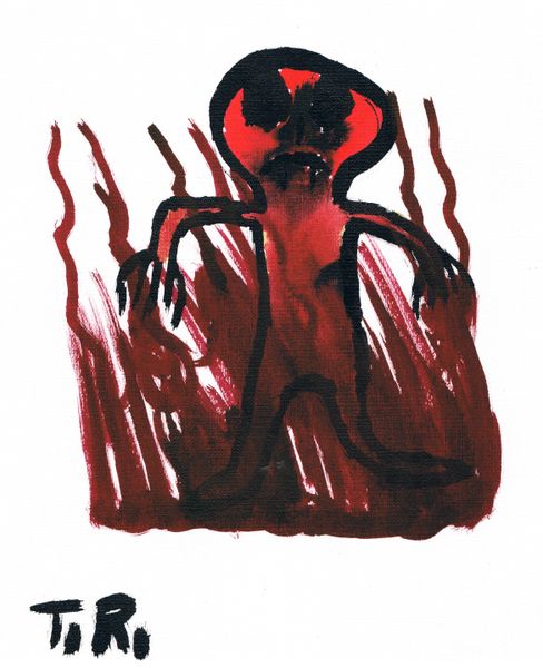 Editor: Here we have Thomas Riesner's mixed-media painting, "IMAGE:30," created in 2019. It's… chaotic. My eye is drawn to the central black shape, but I'm struggling to find a clear focal point within the broader composition. It looks like a mandala of figures, framed within an expressionistic border. As a formal analysis, what strikes you first about this painting? Curator: The tension between the ordered geometry implied by the radiating lines and the organic, almost violent, application of paint is certainly striking. Notice how the artist employs a limited palette – predominantly reds, browns, and black – to create a sense of dynamism. Do you observe any relationships in the forms employed? Editor: I see the figures are somewhat childlike, or cartoonish. And the circular composition is tight. Do you mean the relationship between the figures and the ground? Curator: Indeed. The ambiguity of figure-ground relationships generates considerable visual interest. Figures seemingly emerge from and recede back into the background. What is the role of that heavy black line surrounding it all? Editor: It feels like it traps the forms and color. Like an enclosed ecosystem, maybe? So the interaction of these elements - line, color, and ambiguous forms - is crucial to the overall experience. Curator: Precisely. The artist orchestrates these elements to construct a complex, self-contained visual system. Each formal decision informs and amplifies the others. A close examination allows us to recognize it is more than just the representation of an environment. Editor: I see. Looking at the interplay of those design elements makes this more than just caricature or figuration. It becomes this experience where the balance of elements creates visual interest within the work. Thank you, I understand the artist's method more clearly now!