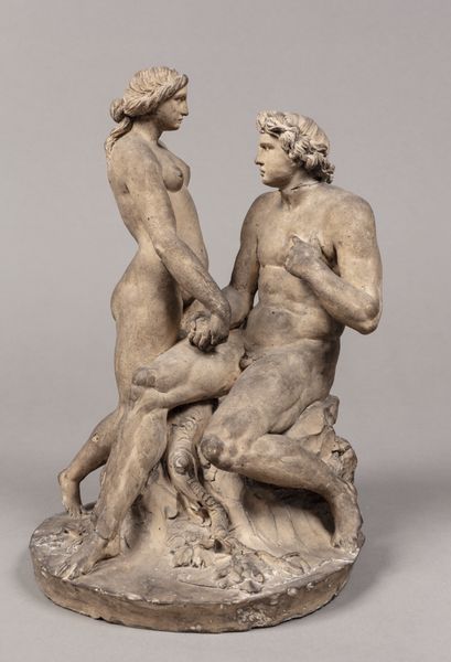 This terracotta sculpture, "Scene uit de zondvloed," was created by Louis Royer. Terracotta, or "baked earth," is a humble material, yet Royer coaxes remarkable drama from it. Notice the contrast between the smooth skin of the figures and the rough base, suggesting the chaos of the flood. The making of this piece involves modeling the clay, likely with added water to make it pliable. Royer would have used tools to refine the details, from the flowing hair to the strained muscles. After drying, the sculpture was fired in a kiln, which gives terracotta its characteristic reddish-brown color and durability. Terracotta has a long history, used for everything from utilitarian vessels to architectural ornament. In the 19th century, it offered a relatively affordable alternative to marble or bronze, enabling artists like Royer to reach a wider audience. This piece allows us to appreciate the skill involved in transforming a simple material into a powerful expression of human emotion. It challenges the hierarchy between craft and fine art.
