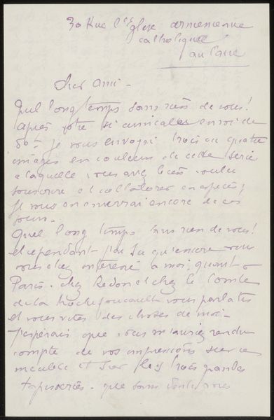This letter was written by Emile Bernard to Héloïse Bernard-Bodin with paper, pen, and ink. Though unassuming, these materials are integral to the letter's meaning. Think about it: paper originates in trees, connecting the letter to the physical world. But its surface is designed for inscription, ready to receive information and convey it across space. The ink, likely iron gall, is a mix of tannin, iron salts, and gum arabic. It etches words onto the page in Bernard's particular hand. The letter then, in its form, becomes a kind of time capsule. It offers a glimpse into the artist’s personal life, and evokes an era when written correspondence was a primary means of communication. It serves as a reminder of labor practices and a slower mode of communication before the digital age. Letters like this one encourage us to appreciate the rich social context of art, blurring the lines between fine art and everyday life.