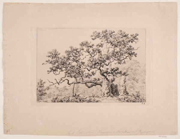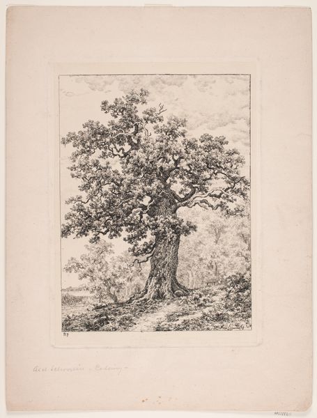 Curator: This is "Hardenberg Egen" by Axel Schovelin, an etching and ink drawing created in 1887. What's your first impression? Editor: There’s a palpable sense of timelessness here. The gnarled oak in the foreground possesses this quiet gravitas—a guardian of the landscape almost. The somber tonality lends a certain melancholic air. Curator: It’s interesting you pick up on that melancholic feel. Given its context within 19th-century Danish art, there's a strong link to national romanticism. Artists like Schovelin were engaging with ideas around the specific character and identity of their nation. Think about the role of the landscape in shaping cultural memory and a sense of belonging. Editor: The tree, then, becomes almost like a national symbol itself. In the context of burgeoning national identities, the oak—with its deep roots and longevity—serves as a powerful symbol of stability and tradition. Are there particular iconographic traditions surrounding oaks in Danish culture? Curator: Absolutely. Throughout European folklore, the oak appears repeatedly. Often seen as sacred, a nexus connecting the earthly and spiritual realms, as a place for communal gatherings, even as a marker of boundaries. I'd venture to say this depiction is also a reflection of broader European anxiety, a searching for authentic experience in the face of modernity. Editor: The etching technique lends itself beautifully to capturing the textures of the bark and leaves—there’s a near obsessive attention to detail. Curator: And note the use of line to build form, almost an anthropological record of the natural world! I feel that its power stems from how it prompts us to consider our place within larger historical and ecological systems. How we, like that oak, are products of forces much larger than ourselves. Editor: I agree, viewing it in this light really enriches my experience. Curator: Well, for me it highlights the enduring connection between landscape, memory and identity.