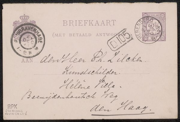 Curator: Look at this lovely relic from the past! This is a postcard addressed to Philip Zilcken, quite possibly dating back to 1899, from Johan Gram. The materials listed suggest it's an ink drawing or print on paper. Editor: A postcard. It’s instantly romantic. Ephemeral, yet bearing witness to a specific moment. Like a butterfly pinned under glass... except it escaped! And who *were* Philip Zilcken and Johan Gram, what dreams did they whisper on paper? I love the anticipation brimming from it. Curator: It speaks of connection across distances. It would have felt particularly precious in a time when immediate digital communication wasn't even a glimmer in anyone's eye! What visual cues do you glean from it? Editor: Well, there’s the handwriting. That beautiful cursive… so intimate, flowing across the standardized grid of the "Briefkaart". A fascinating blend of formal structure meeting the deeply personal gesture. And the stamps—miniature landscapes of power and bureaucracy. A Netherlands stamp, with Queen Wilhelmina no doubt… a portrait as symbol. Then these inky, smudged postmarks—"’S Gravenhage," now we call it Den Haag - so potent of place. A physical record of the journey taken to meet his correspondent. Curator: Exactly! The stamps and postal marks tell such a layered story. These kinds of incidental visual details create an implicit symbolism we can see repeated everywhere as a visual motif in a range of historical and social narratives, across cultures. It offers the viewer many access points for engagement and recognition, especially when they are seen to resonate to common humanity. Editor: Yes, but on a slightly somber note. There’s an element of faded glory here, that reminds me that human life and social systems fade with the relentless beat of time, regardless of the moment that was recorded and held still on a card or other memorial. I imagine our emails in some future museum—relics of such transient times. The same poignancy will remain. Curator: Oh, that's rather a depressing thought! Still, it brings the personal and profound into an important focus. Thanks! Editor: Thanks to you too. It makes me think a simple ink drawing can echo a larger story and maybe we can be encouraged to look deeper and closer than we might otherwise have done!