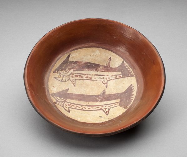 Curator: It's quite unassuming at first glance, isn't it? Editor: A rustic feeling washes over me... primitive in the best possible way. Is this ancient pottery? Curator: It is! What we have here is a ceramic bowl originating from the Paracas culture, circa 650 CE. The Art Institute of Chicago currently holds it. Note the painted decoration; it's referred to as “Bowl with Fish Motif." Editor: Motif, indeed! One stylized fish dominates the inner bowl, with smaller circular forms floating around it. Very subtle color choices. What’s the effect of painting in this way, against such a dark surface? Curator: The dark slip provides contrast, certainly highlighting the warm ochre hues that render the fish and surrounding pattern. It almost feels like seeing the fish dart through dark waters, these light forms evoking bubbles, too. The fish itself, though, is quite abstract, yet manages to still convey movement, swimming upwards...or maybe leaping! It really stimulates the imagination. Editor: Those geometric borders feel crucial, lending some visual rhythm. See the top and bottom? Simple chevrons up top; neat rows below. The effect provides grounding, organizing that otherwise unbounded inner space. Curator: The geometry serves almost as a visual metaphor, boxing up this fish as if we humans thought we could ever actually contain or control Nature’s abundance! This work almost begs one to dream and reflect. What purpose did these Paracas people intend for such bowls? Editor: Possibly utilitarian, certainly, though this decorative investment speaks toward some ceremonial application, some sacred feasting practice. Though such uses elude us still today. Curator: Despite that uncertainty, isn't it remarkable that we are able to still observe it, these centuries later, and ponder their lives. And consider these bowls themselves: artifacts now, but so integral, once, to Paracan life. I wonder what stories these could tell. Editor: And this, maybe, is why these aesthetic archetypes are so significant...echoing humanity's most primitive selves, back toward its most forward leaning selves. A timeless effect, really.