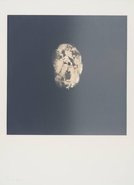Curator: Looking at this untitled print by John Walker, I'm struck by its quietude. It feels almost like a forgotten fragment. Editor: Yes, at first glance, the stark contrast and minimal composition evoke a sense of isolation, a small world suspended in emptiness. The eye is immediately drawn to the shapes in the dark lozenge. Are they stones? Or perhaps seeds? Curator: The forms do resemble natural objects, evoking primal symbols of growth, time, and memory. Walker often explored themes of transience and the traces we leave behind. Editor: The darkness within the diamond form could represent the unconscious, with these objects emerging as if from the depths of our collective past. Curator: Exactly, and the use of black and white reinforces the symbolic weight, adding layers of meaning to the ostensibly simple composition. The negative space is like a stage. Editor: It is quite a captivating piece, and considering Walker’s career, I see the print as a meditation on the power of simple forms to unlock deeper narratives. Curator: I agree. There's a raw, essential quality to this artwork, a reminder of the profound stories held within the seemingly mundane.