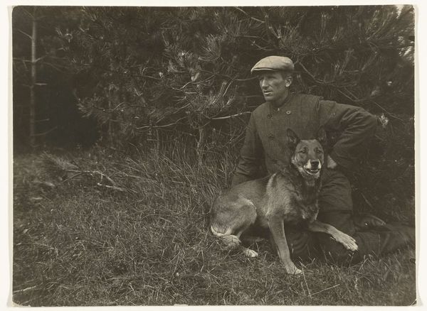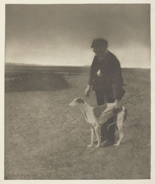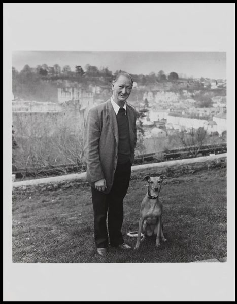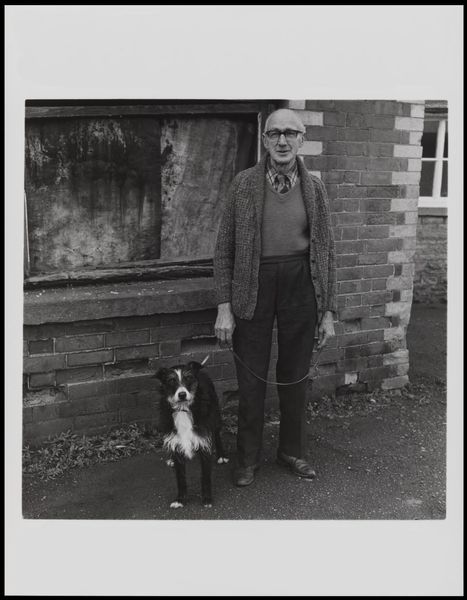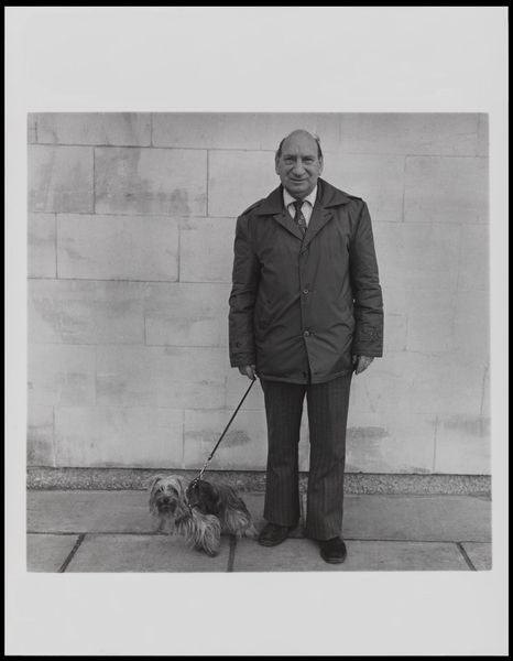 Editor: Keith Arnatt's photograph, "Walking the Dog", captures a man and his dog in a seemingly mundane moment. There's something about the starkness of the black and white that makes it feel a bit melancholy. What do you see in this piece? Curator: I see a commentary on class, gender, and the performance of everyday life. Arnatt's photograph captures a very specific kind of Britishness, perhaps even a critique. Consider the symbolism of the dog as a companion – is it really companionship, or a symbol of status and control? Does the man's attire suggest a certain role he feels compelled to play? Editor: That’s interesting. I hadn’t considered it in terms of status, but I can see that now. Curator: Exactly. And thinking about the photograph itself, black and white flattens the scene, depersonalizing the subjects. It highlights the artifice of the pose. What does it mean to "walk the dog"? Is it freedom or constraint? Editor: I guess I was seeing it too simply. Thinking about the social and cultural context definitely adds layers of meaning. Curator: Precisely. Art invites us to question these representations and our assumptions.