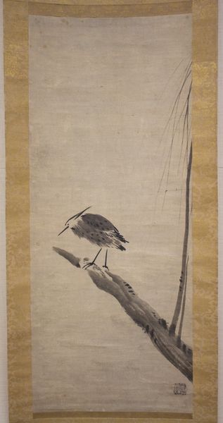 Curator: Welcome. Before us is the ink painting, "Bird", by Kenkō Shōkei. This artwork, likely created sometime between 1467 and 1533, utilizes ink and watercolor on paper, presenting a serene avian scene. Editor: It has a delicate, almost mournful quality, doesn't it? The restrained palette and the vertical composition evoke a sense of quiet contemplation. It's not merely representational; there's a feeling of... yearning? Curator: Yes, that aligns with the deeper symbolic weight. Birds in East Asian art often carry messages of freedom, but also of transience, a poignant reminder of life's fleeting nature and the ephemeral quality of beauty. The bird here, perched precariously on the bare branch, is isolated within an immensity. It evokes powerful feelings of existential impermanence, echoing our deepest hopes, longings, and even our fear of isolation in a world marked by ceaseless change. Editor: The composition certainly reinforces that sense of solitude. The vast empty space above the bird contrasts starkly with the detailed rendering of its feathers. That careful rendering almost seems to elevate it to a kind of symbol. Curator: Precisely. In Shōkei’s time, literati painting, to which this piece alludes, was associated with intellectual and spiritual pursuits, blending painting, poetry, and calligraphy. It signified moral strength and refinement and fostered intimate personal contemplation, even when—as here—ostensibly simply presenting an image of a bird. Editor: It’s amazing how a seemingly simple ink painting of a bird can carry such cultural and emotional depth. Looking closer, the minimal details manage to imply an entire world. The careful application of washes creates a remarkable sense of depth, particularly given the limitations of the medium. Curator: These traditional East Asian artistic materials inherently reflect impermanence because of their intrinsic physical properties, which in turn connects back to historical perceptions and philosophies about humanity. Editor: Seeing the image through that historical, symbolic lens really enriches my understanding and amplifies the emotional impact, while my close formal examination draws me deeper into appreciating the exquisite visual composition. Curator: And I think both perspectives, delving into form and exploring iconographic lineage, heighten the experience, revealing fresh perspectives on a traditional artistic form.