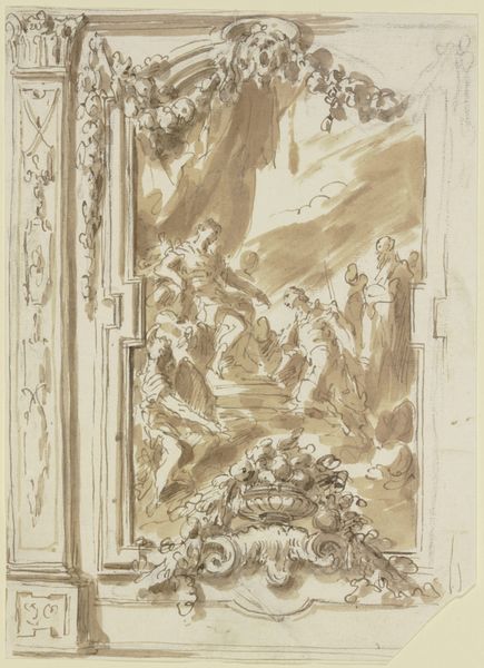 Curator: This is Giovanni Battista Piranesi's "Grottesco with the Tomb of Nero," created around 1747, a compelling example of his architectural fantasies rendered in pencil, graphite, and etching. Editor: Fantasies indeed! At first glance, it's this beautiful ruin...or rather, a suggestive sketch of one. All these monumental forms fighting for space on the paper, a touch unsettling but undeniably gorgeous. Curator: The piece showcases Piranesi's deep engagement with Roman antiquity, but through a filter of Romantic sensibility. It represents the Tomb of Nero as an elaborate, almost theatrical structure, teeming with detail. We must consider the context: Piranesi created these imaginary depictions based on fragments of buildings, playing with the viewers perception of actual history, he essentially re-imagines, and to a degree challenges it. Editor: I see that now, because that’s what grabbed me! It has this quality of being incomplete, not quite defined...but I don't think it detracts at all. It leaves space for the imagination. Are those little figures scurrying around, are they frightened, perhaps worshipping the tomb or simply being a general rabble of Romans? Curator: Precisely! This blurring of historical accuracy allowed him to engage with themes of power, decay, and the sublime. It reveals an active interest in using visual media to reflect on socio-political conditions, as well as inviting audiences to construct or question accepted historical and political narratives. Editor: Right, the piece speaks to how we remember the past and use art to connect it with the present! The monumentality is what lingers. Something massive and ancient, but fragile, ephemeral almost...like a half-remembered dream of an empire, all that might and majesty turned to beautiful, suggestive ruin. Curator: Exactly, it reflects the cyclical nature of civilizations, empires, as Piranesi implies with this image! It acts as a silent critique of present times by referencing this imposing past. Thank you. Editor: Thanks! This was such a joy. I’ll go have a similar chat now with a cheese danish, if you don’t mind!