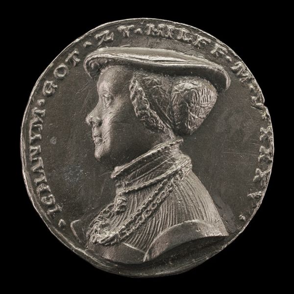 Curator: The crisp profile immediately grabs you, doesn't it? It’s a bronze relief titled "Portrait of a Woman," and it appears to be a Renaissance work in the style of a portrait medal. Editor: It has a remarkably serene quality. The smooth bronze surface and restrained lines lend it an almost ethereal feel, yet the subject's expression suggests an inner strength. Curator: Indeed. These portrait medals served multiple functions. On one level, they captured an individual’s likeness, often commemorating their achievements or status. But they also circulated ideas about the individual's role in the larger social context. Think of them as early forms of portable propaganda, influencing perceptions and constructing a legacy. Editor: Looking closely at the text, “VARIER SANS,” what might that tell us about her, and the overall composition of the piece? Curator: That is a fascinating point to explore because portrait medals would occasionally feature mottos that spoke to a virtue or intention of the commemorated individual. But that is a challenge here, the portrait’s medal lacks identifying marks like dates or an artist’s signature, making definitive claims tough. Her head covering hints at a specific social or religious position within the social context, which suggests further historical research will be necessary. Editor: I notice that the circular form creates a kind of frame, directing my gaze inward. The simplicity of the woman’s garments contrasts with the crisp lettering, suggesting a hierarchy of importance within the artwork. It feels almost sculptural in its form. Curator: Exactly. The subtle shifts in relief give it dimension, defying its medium's usual two-dimensionality. This fusion of visual elements is characteristic of Renaissance art, revealing their ambitions to demonstrate control and manipulate perceptions about status and identity within social groups and relations. Editor: I walk away seeing it as more than just a pretty portrait. It speaks volumes about artistic technique and function, leaving an imprint that stretches far beyond the confines of the artwork itself. Curator: Absolutely. It acts as a snapshot into the cultural currents of its time, reflecting both artistic skill and the ever-present dialogue between image and society.