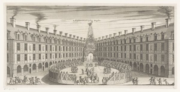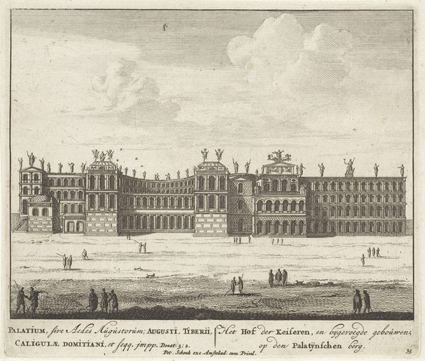 Editor: Here we have "Veüe du Château de Richelieu du Côté du Parc" – that’s "View of the Chateau de Richelieu from the Park Side," a pen and ink etching by Adam Perelle, dating sometime between 1640 and 1695. It strikes me as a carefully constructed world. I'm curious, what stands out to you in this piece? Curator: Oh, the Château de Richelieu! You know, when I look at this, I don't just see a building; I see the ghost of ambition shimmering in the air. Perelle has captured the grandeur, sure, but also a very human theater playing out in the foreground. All those little figures strolling, playing… what do *they* whisper to you? Editor: Well, they seem almost separate from the Chateau itself, like they're acting out their lives in its shadow, but not necessarily a part of it. It makes the Chateau feel more… imposing, maybe? Curator: Exactly! The figures give scale, but they also highlight the separation between the ruling class and everyone else, something very true for the time period, dont you think? Notice how Perelle uses linear perspective to emphasize the chateau's dominance, a subtle power play on paper, you could almost say! Editor: I hadn't considered it like that, more like documentation! Curator: Ah, but isn't art always a document of its time, consciously or unconsciously? This baroque beauty hides a story within those meticulously etched lines. And who knows what games were played on those grounds. Editor: Fascinating! I’ll never see landscapes the same way. Curator: I think that's beautiful, our impressions are truly altered, and so, the artwork takes a life on of its own with each interpretation.