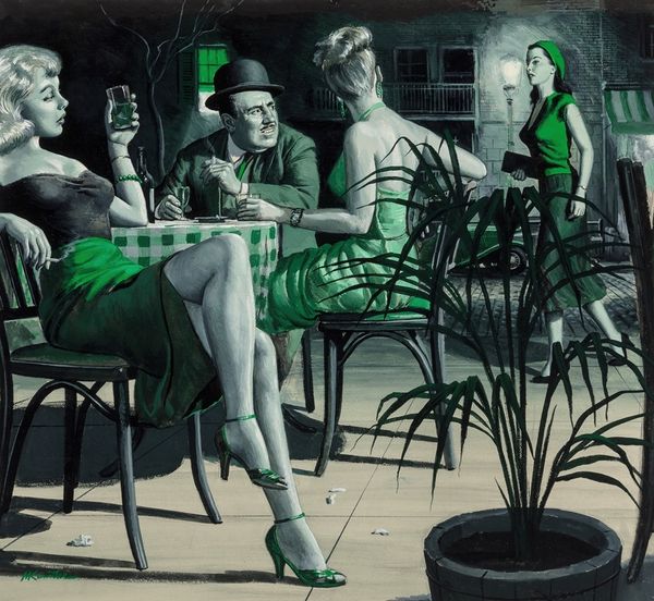 Editor: This is Gerhard Richter's "Party" from 1963, a mixed-media painting that has a rather unsettling feel. There's a strange tension between the apparent glamour of the figures and the defacement— almost violence— implied by the red and gold markings. What do you make of this jarring combination? Curator: It's important to understand the historical context. Richter began this while living in East Germany and then transitioned to West Germany shortly before creating “Party.” Consider the post-war societal anxieties and the critique of consumerism emerging in the West. The "party" is a powerful social image; what could this distorted portrayal suggest about his view of such gatherings, given the historical context? Editor: So, you're saying the disturbing marks might be a way of commenting on the superficiality or perhaps even the artificiality of these social events and perhaps even wealth itself? Like scratching at the glossy surface to reveal something unpleasant underneath? Curator: Precisely. Richter was engaging with a kind of visual and social commentary. He was acutely aware of how images are constructed and how they function within society. The red marks might represent a kind of violence inflicted on these constructed images, reflecting broader social disruptions and challenges to idealized images of bourgeois life. And even his mixed media speaks to a changing time, a departure from strict schools of art. How does the title, "Party," play into that interpretation for you? Editor: Well, "Party" feels ironic, almost cynical. It takes this idealised scene of celebration and then undermines it, exposing what he felt was, like you say, an undercurrent of something darker. The medium reflecting that transition in his own life. I didn't know the historical background and how it really affected his paintings! Curator: Indeed. Richter uses a deliberately unsettling aesthetic to provoke a critical examination of the values and realities behind seemingly celebratory facades. His work encourages us to look beneath the surface and question the very nature of what is presented as ideal. Editor: Thanks, that’s really changed how I view the piece, seeing how deeply it is intertwined with that period of history!