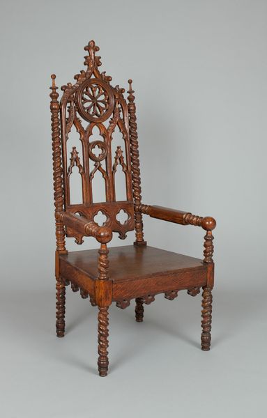 This ‘Armchair of Jacoba of Bavaria’ was crafted from oak by an anonymous maker. Immediately, the chair presents itself with a pronounced verticality, emphasized by the high backrest and columnar supports. The structure is articulated through geometric forms, where circles soften the rigid lines, offering a visual counterpoint. The linear carvings on the back panel draw the eye upward, contrasting with the solid planes of the seat and armrests. This tension between the vertical aspiration and the horizontal grounding gives the chair its dynamic presence. Observe how the play of light and shadow accentuates the wood's texture, underscoring its material presence. The chair destabilizes established meanings of domestic comfort by imbuing the functional object with symbolic significance. The semiotic system embedded in the chair is based on hierarchy and power. The chair’s design integrates both form and cultural expression. It transcends the utilitarian to become a symbol of its time, inviting ongoing interpretation.