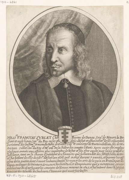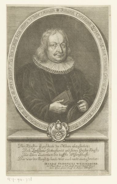Curator: Upon examination, this print from 1654 by Jacob van Meurs portrays Nicolaus Arnoldus. The print, held at the Rijksmuseum, strikes me as rather severe in its overall impression. Editor: I see that. Its severity underscores, I think, the cultural landscape of the Dutch Republic during the mid-17th century. Arnoldus, a theologian and professor, existed within the context of intense religious debates and intellectual ferment. This portrait serves not only as a likeness, but also as an assertion of his position and status within that environment. The visual language—the Baroque style’s formality tempered by the line work typical of academic art—reinforces this sense of authority. The man's steely gaze stares right at you, daring you to engage! Curator: Indeed, the meticulous details of the engraving capture Arnoldus’s somber expression. Let's focus on the oval frame, dense with inscriptions and symbolism. The Latin phrases serve as a framework to position Arnoldus not merely as an individual but as a figure worthy of study. Also note the skull above the figure; a visual device common for its time. Editor: I appreciate your attention to the structural integrity of the piece, with the oval precisely framing the sitter and text as integral compositional elements. It is, from a formal perspective, meticulously balanced. Consider, too, how the print medium itself contributes to the work’s overall impact. As an engraving, it would have been relatively easily reproducible, which enhanced the subject’s influence. Curator: The materiality of the print is very significant! The black and white medium lends itself to a timeless and ubiquitous aesthetic that allowed for accessibility for many who did not enjoy art collecting! And it’s an artifact now of the period that allows us insights into 17th century academia and society, even as we consider that this Baroque portrait immortalizes a professor, it shows that he actively played a part in perpetuating systems of intellectual authority within the confines of academia. Editor: I concur that the work's cultural function enhances an analysis of the portrait's line and textual structure. His pose and gaze actively solidify his authoritative position, in dialogue with text, medium and graphic setting. Curator: Precisely, the fusion of style, academic visual language and his role as a figure in academia created something of substance with a presence even to this day. Editor: An elegant testament to both artistic technique and societal status.