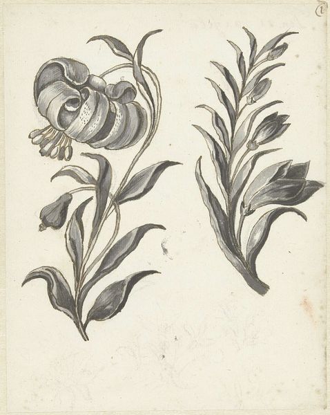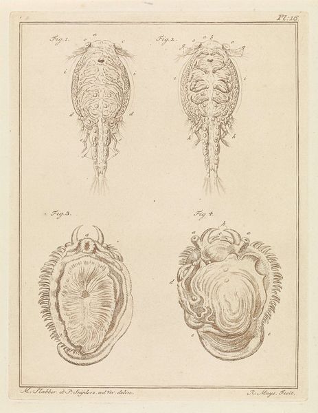 Robbert Muys created this image of a ‘Red Spider’ using pen and brown ink with brush and grey wash on paper. The composition is divided vertically into three segments showing the same insect at different scales. Muys' work, like much scientific illustration of the period, focuses on precision. The detailed rendering of the spider, with its delicate legs and hairy body, serves a clear, descriptive purpose. The spider's body is carefully textured with the meticulous application of wash, giving the creature a tangible presence. The structural clarity in the image allows us to read the image almost as a diagram. The use of scale is part of a broader cultural interest in cataloging and understanding the natural world through visual means. Notice the artist’s emphasis on capturing the spider’s form, which transforms this natural subject into an exercise of visual order and classification.