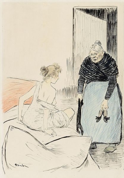 Curator: Welcome. Today we're looking at Miep de Feijter's ink and pen drawing, "Jongen met weegschaal in een bed," dating circa 1928 to 1941. What are your initial impressions? Editor: I’m struck by the simplicity of the line work, the heavy outlines balanced with open space creating an atmosphere of both tenderness and isolation. It almost feels like a scene lifted from a graphic novel in its making. Curator: That graphic quality is something I noticed as well. It points toward a deliberate engagement with popular forms of visual media. Notice how De Feijter utilized ink and pen to produce defined lines and clear shapes, suggesting mass production techniques relevant in creating reproduced images, as one might find in a magazine. The materials were relatively inexpensive. Editor: Absolutely. The drawing hints at a wider commentary on caregiving within domestic settings, positioning the maternal figure—likely the child's mother or caretaker— in an attitude of constant giving. She embodies the societal expectations of women and mothers as nurturers. The tulips in the background emphasize notions of cyclical beauty, fertility, spring cleaning! Curator: The placement of the figure indeed invites social interpretation. I am particularly interested in the materiality of the tools being handled. It has a metal cup device – is this to deliver medicine or measure ingredients? What impact would these commodities have had on household functions during the period it was created? What did having reliable materials symbolize socially? Editor: The fact that the boy is holding scales in bed brings interesting contradictions: his childlike form, and what could easily be a difficult diagnosis of ailment that leads to him having to weight foods in his bed! This brings us to uncomfortable questions around institutional power, particularly surrounding women's care work for the domestic sphere. It could even act as metaphor. Curator: These readings enrich our understanding of the work's capacity to embody the era's shifting perspectives on gender and health. De Feijter utilizes art to illustrate how even items of scientific significance permeate and become reimagined within familial space. Editor: It certainly pushes viewers to question their preconceptions. Looking at it in its totality, the artwork can inspire thought and dialogue about how societal expectations, health infrastructure, and art intertwine in daily experiences. Curator: An interesting intersection that De Feijter achieves effectively through relatively minimal form, inviting discourse well beyond its initial making.