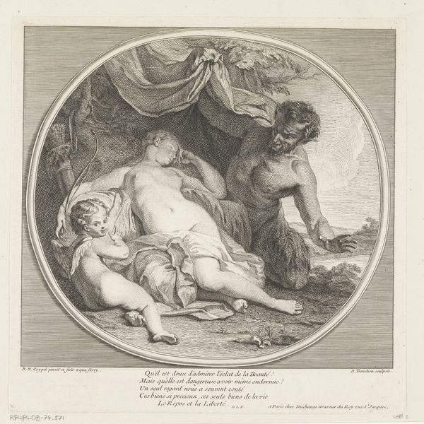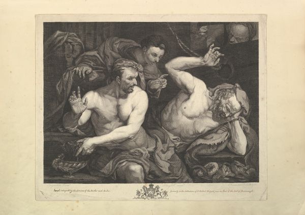 Editor: Here we have "David Beheading Goliath," an engraving by Giacomo Piccini from after 1627. It’s quite striking—a graphic and decisive moment captured in fine lines. I am curious, from your perspective, how would you interpret this depiction in its historical context? Curator: It’s critical to remember that representations of David and Goliath, especially during and after the Counter-Reformation, served less as simple biblical illustration and more as potent symbols of divine favor and righteous victory, subtly reminding audiences about the prevailing socio-political currents orchestrated by patrons within their institutional mandates. Have you considered who would have been the target audience for this print? Editor: I imagine prints made this story more widely available than, say, a large-scale painting in a palace or church. Were they meant to encourage the masses? Curator: Exactly! Disseminating ideological messages via affordable imagery became increasingly vital. The choice to portray this gruesome moment—the literal decapitation—serves a very public purpose: a visceral representation of triumph of right over might that an elite was eager to see amplified and become deeply embedded in the social consciousness. It raises interesting questions about art as a vehicle for shaping popular sentiment. Consider, what does it tell us about the use of printmaking and dissemination? Editor: That makes perfect sense! So it wasn’t just about telling a Bible story; it was about solidifying power structures and cultural narratives in society. I never thought about it that way before, but it explains a lot about why certain images were so prevalent. Thank you! Curator: Indeed. The production and distribution of prints had everything to do with maintaining a social order as much as telling a story. A fresh reminder for us to always contextualize art within broader historical power dynamics.