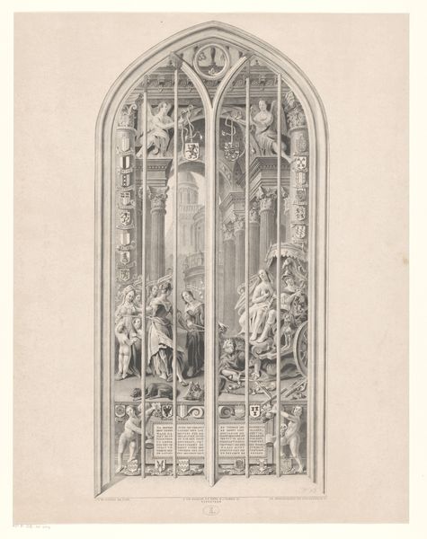 Editor: This is "Westelijk raam van de Kathedraal van Exeter," or the West Window of Exeter Cathedral, an engraving by Robert Pranker dating around 1767 to 1769. The level of detail is astonishing. What strikes me is how architectural renderings like this attempt to capture not just the physical space but also, perhaps, something about the sacred space itself. How do you interpret this work? Curator: I see it as a fascinating visual document, imbued with layers of symbolic meaning deeply rooted in cultural memory. The Gothic architecture, with its pointed arches and elaborate tracery, speaks to a particular era's aspirations for the divine. Do you notice how the geometry, particularly in the rose window at the top, evokes a sense of cosmic order? Editor: Absolutely. It's almost like a mandala, each component leading to the next. Curator: Precisely. And consider the figures depicted below. Though static, each would carry significant weight within the context of the church's teachings – figures embodying virtues, apostles perhaps, all reinforcing a narrative. These weren't just decorative elements, but carefully chosen symbols meant to educate and inspire. Editor: So the window is like a visual sermon. I wonder if the viewer at the time understood all these symbols? Curator: That’s a great question. It speaks to the cultural literacy of the period, but even without direct knowledge, the impression of power and importance would still communicate a message, don't you think? Editor: That makes a lot of sense. I definitely learned a great deal about how every visual element matters and functions as cultural symbol, each of the narratives adding a deeper and complex layer to the architecture.