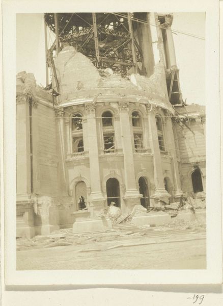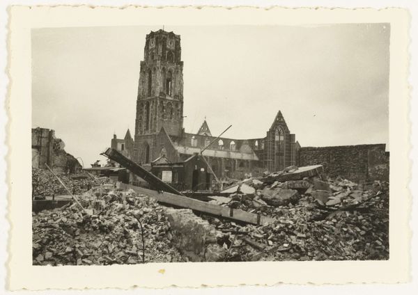 Editor: This photograph, titled "Verwoeste Eusebiuskerk te Arnhem" or "Devastated Eusebius Church in Arnhem", was taken by Anefo between 1945 and 1946. It’s a gelatin silver print that depicts the ruins of a church. It has such a desolate feeling; the architecture is monumental but so broken. What kind of story do you think this image tells? Curator: It speaks volumes about the human cost of conflict, doesn’t it? Here, we’re not just looking at architectural devastation, but the violent disruption of a community’s spiritual and social center. The Eusebius Church would have been a place of gathering, of shared identity. Consider the historical context: the Netherlands suffered terribly during the Second World War. Doesn't this image urge us to think about the intersection of national identity, faith, and the physical realities of war? What does the black and white medium evoke for you? Editor: It amplifies that sense of rawness, and honestly, timelessness. The photo feels immediate, like a fresh wound. The landscape is barren. Are there any hidden figures of resistance implied in the imagery? Curator: The presence of individuals amidst the ruins – are they merely observers, or are they agents of rebuilding and remembrance? How do we interpret their relationship to the destroyed space? It’s critical to remember that history isn't just dates and events; it is human experiences, trauma, and resilience. Editor: So the image works beyond just documenting to acting as a moment of both looking back and urging the society to look forward. Thank you, it's incredible how much history a single photograph can hold. Curator: And how much that history continues to inform our present and shape our future. The act of looking is never neutral.
