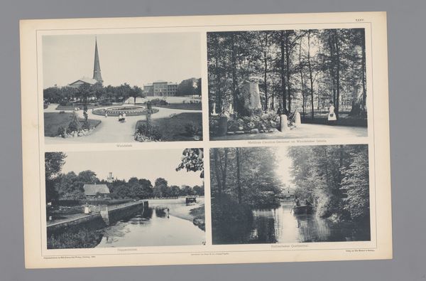 This photogravure by Wilhelm Dreesen presents four distinct scenes, each meticulously framed within a larger composition. The subdued tones and high contrast create a formal arrangement that invites contemplation. Dreesen's strategic use of light and shadow transforms each scene into a study of form and depth. The landscapes, featuring water and architecture, reflect a structured approach. The reflections in the water are not mere reproductions of the scene, but rather distorted and inverted versions that challenge our perception. The architecture, solid and imposing, provides a counterpoint to the fluidity of the water. The work seems to reflect a post-structuralist sensibility. Dreesen offers a discourse on the relationship between representation and reality. Each photograph destabilizes any fixed interpretation, inviting us to consider how meaning is constructed through visual cues.