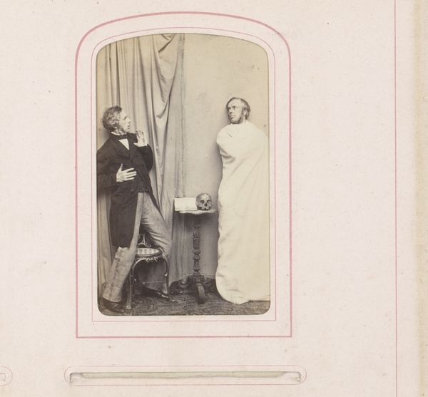 Editor: So, this is "Two Boys Acting an Offensive and Unapproachable Pose," a photograph by Leonard de Koningh, sometime between 1864 and 1879. I'm immediately struck by the theatricality of it. It's more than just a portrait, but an act. What do you make of this staged interaction? Curator: It's fascinating, isn't it? Notice the gestures: one boy leaning, arm assertively placed, the other self-contained, arms crossed. These postures are potent symbols of dominance and defiance. Even their outfits suggest something of roles they perform in the world. But why strike a 'threatening pose?’ Editor: Is it purely performative or does it mirror societal expectations of masculinity at the time? Are they playing roles they’ve seen modeled for them? Curator: Precisely! Think of the 19th-century concept of the ‘manly arts,’ a whole philosophy of physical and moral development aimed at creating the ideal citizen. These boys may be acting out what they believe it means to be ‘men’ - brave, stoic, and ready for anything. Editor: So it's not just a game, it’s rehearsal? The little table feels so symbolic too. A barrier? Curator: Indeed, it’s almost as if they are using the small table to mark a boundary of personal space. Could this photograph be viewed as an exploration of nascent male identities, still being molded? Editor: I never would have considered all the layers of symbolism! Seeing the performance in the photograph has revealed the potential societal weight of these “genres.” Curator: It underscores how images operate, both consciously and unconsciously, shaping perceptions.