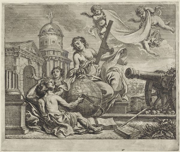 Curator: This engraving is attributed to Giovanni Battista Pasqualini, a Roman artist active in the early 17th century. It's called "Aurora," depicting the Roman goddess of dawn. Editor: The upward thrust of the composition is quite striking. It's balanced by a sense of swirling movement in the clouds and figures. Curator: Absolutely. Pasqualini's Aurora isn't just about aesthetic beauty, but also reinforces classical mythology within the socio-political context of Rome at the time. It was a period of great artistic and architectural flourishing, supported by powerful patrons. Editor: The hatching and cross-hatching give a real sense of depth and volume. Look at the muscularity of those horses. It's all about light and shadow. Curator: Seeing this print in the Harvard Art Museums reminds us that art wasn't just passively received. Prints helped distribute ideas across Europe, playing a role in shaping cultural values. Editor: For me, it’s the dynamic energy, the bold contrasts of light and dark, that make the artwork so appealing. Curator: I'm left thinking about the power of art to embody cultural values. Editor: Yes, and how technical skill elevates the subject matter into something truly memorable.