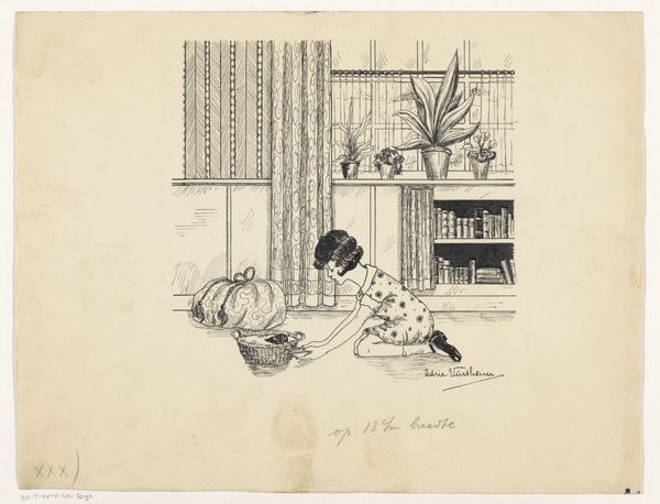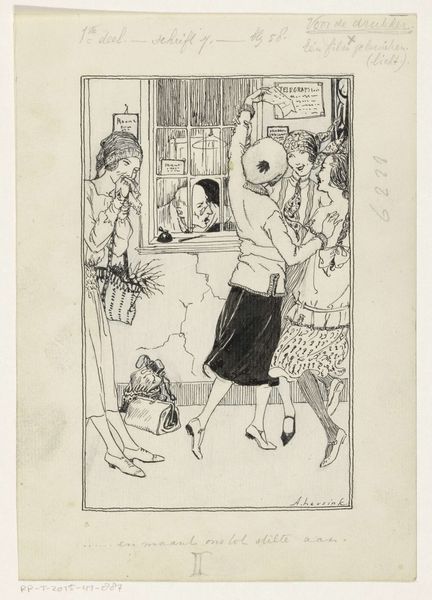 Curator: Here we have “Woman and Children Looking at a Burning Building,” a drawing made with ink on paper by Adrie Vürtheim, dating from between 1917 and 1970. Editor: My initial response is that it’s visually arresting! The stark black and white contrast immediately draws the eye to the glowing inferno visible through the window. Curator: Indeed. Vürtheim's work frequently touched upon domestic life and societal observation. Given the historical context of the early to mid-20th century, one might interpret this drawing as a commentary on the anxieties of war, social upheaval, and loss experienced in a world marked by both world wars. The building ablaze serves as a potent metaphor for societal instability, observed by those within the presumed safety of their home. Editor: The composition certainly enhances that interpretation. The window acts as a rigid frame, literally and figuratively separating the observers from the observed. The figures are meticulously outlined, their static poses amplifying a sense of frozen horror. Curator: The choice to render this scene in ink further emphasizes the starkness of the moment, offering very little middle ground between the safety of the home and the disaster that plays out beyond the glass. We see a snapshot of the voyeuristic role imposed upon the inhabitants. Editor: I find it interesting that Vürtheim uses dense, almost frantic hatching to depict the fire, a striking contrast to the cleaner lines defining the figures and the room. This visual choice directs our focus but also amplifies the chaotic, destructive nature of the fire itself. It dominates the small narrative moment of looking at a dangerous world through one’s window. Curator: Yes, and one can almost see the social dynamic present in many homes where an impending fear hangs over their heads: the mother a solid protective figure while the children embody a somewhat frightening curiosity. Vürtheim shows the public becoming very, very personal. Editor: The drawing invites us to consider the very nature of looking, observing from a place of privilege. We too are positioned as spectators, implicating us in the scene. I am reminded that formalism is rarely neutral; choices about line, texture, and composition construct a perspective that helps inform how we see tragedy and everyday existence. Curator: Reflecting on it now, the artist uses her artwork as a time capsule. We get a brief moment of people from the past contemplating a catastrophic future. Editor: Ultimately, it’s a compelling reminder that art often reflects not just the world as it is, but also the very act of witnessing it.
