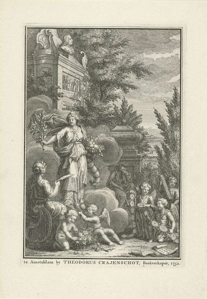 This etching, Landschap met twee riviergoden, was made by Jan Caspar Philips in the 18th century and is currently held in the Rijksmuseum. The composition unfolds through careful arrangements of line and form, creating an allegory of fertile lands. The gaze is drawn to the two river gods, reclining amidst a landscape of calculated harmony. Note how the figures are integrated into the environment, with the flowing water echoing the curves of their bodies, suggesting a unity between nature and the divine. Philips structures the landscape with symbolic elements. The river gods holding their attributes, like the oar-like object, symbolize control and abundance. These visual choices point to a structured view of nature as both a resource and a symbolic space that embodies cultural values and power. The etching invites us to decode its visual language, revealing an interplay between representation and ideology.
