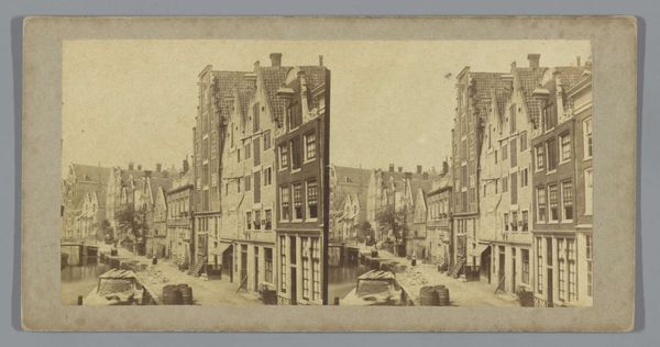 Editor: Here we have Pieter Oosterhuis's 1859 photograph, “Reguliersbreestraat, gezien richting de Munt, Amsterdam,” currently at the Rijksmuseum. The receding lines of buildings create such a feeling of depth. How do you interpret the almost ghostly presence of the distant tower? Curator: That's a fascinating observation! I see that tower as an echo of a deeply embedded civic identity. Towers often symbolize power, aspiration, and connection to both the earthly and the divine. Here, shrouded in the photographic haze, it speaks to the enduring presence of established institutions amid the bustle of everyday life. Note the angle of view: why do you think Oosterhuis situated his camera precisely at this point in the street? Editor: Maybe he was interested in showing the street as an artery, something connecting people to something greater beyond their individual experiences. Is the photographic process itself important here? Curator: Absolutely. The nascent technology of photography aimed, at least initially, for a truthful representation. However, even here, in this pursuit of realism, we have a symbolic rendering. Consider the stillness of the street, made possible by the long exposure. Is that stillness literal? What deeper meaning can be ascribed to the seeming emptiness of the thoroughfare? Editor: That’s true; I hadn’t considered the effect of the exposure time on the image's symbolism. It seems that the symbolism exists in the process as much as the composition. Curator: Precisely! This image speaks to the interwoven narratives of progress and permanence. A cultural memory etched in light and shadow. Editor: That's given me so much to consider. Thanks! Curator: My pleasure. It's these visual echoes that keep history alive, wouldn’t you agree?