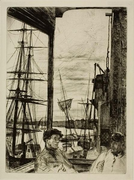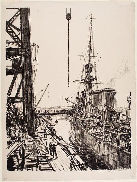 Muirhead Bone made "Ready for Sea" with ink on paper, and it’s all about the nitty-gritty process of drawing. Look at the network of lines, like a nervous system laid bare, each one a decision, a little tremor of the hand. The texture is like dry land, all scratched and hatched, giving depth to the industrial scene. Bone must have used a fine nib, or maybe even a dry brush, to get that gritty feel, you can almost feel the rough surface of the metal and wood. It's a symphony of blacks and beiges, a muted palette that speaks of serious business. Check out the mass of tiny figures on the ship and dock. It's a marvel of detail, each a tiny mark carrying the weight of the whole scene. The ghost of Piranesi hangs heavy here, maybe even a dash of Whistler in the tonal restraint. Art's just one big conversation, right? It's not about nailing down one perfect meaning, but about letting the possibilities float, like ships on an endless horizon.