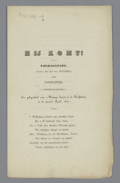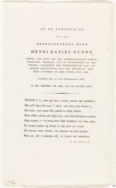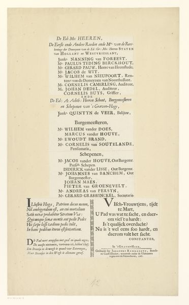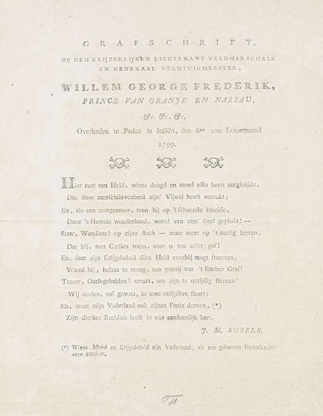 This broadside lamenting the death of Princess Wilhelmina in 1820 was printed using letterpress, a technology that allowed for the relatively quick dissemination of texts to a wide audience. The text expresses the grief felt in The Hague, referring to the princess as the widow of the unforgettable Stadtholder, Willem de Vijfde. Broadsides like this one played a significant role in shaping public sentiment in the Netherlands at the time. By framing Wilhelmina's death as a moment of national mourning, the anonymous author seeks to evoke a sense of collective identity around the House of Orange-Nassau. The piece not only reflects the social hierarchy of the time, but also participates in reinforcing it. Note the embellishments: the skulls lend a funereal air. As historians, we might consult archival records to understand who commissioned and distributed the broadside, or analyze other texts from the period to compare sentiments. The social and institutional contexts are crucial for interpreting the artwork’s meaning and role in shaping public opinion.