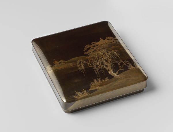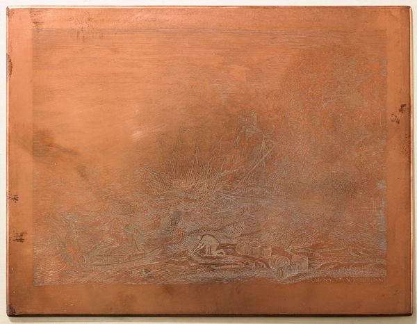 Curator: Welcome. We're standing before what the Rijksmuseum identifies as a "Pastorale scène" crafted sometime between 1826 and 1886 by Dirk Jurriaan Sluyter. It’s mixed media, with the subtle application of watercolours. What are your first impressions? Editor: A profound sense of antiquity and muted beauty. The colour palette evokes aged photographs, where memory and reality seem to coalesce. It reminds me of objects unearthed from centuries past. Is it on metal? Curator: Yes, I understand your reading. The support is metal, yes. The work strikes me as a melancholic reflection on idealized rural life, seen through a lens that perhaps omits the more arduous aspects of the era. The fact that it is framed so prominently on a rectangular object immediately forces a kind of mediation. It acknowledges artifice, to some extent. Editor: The landscape feels like a visual echo. Note how it appears contained within a tarnished frame—suggesting something held in place or perhaps, suppressed. It triggers memories of childhood scenes depicted on old trays, imbuing domestic objects with bucolic beauty. Curator: Interesting. Perhaps that domestic quality touches upon anxieties around women’s labour. Are we seeing a pastoral scene that obscures gendered realities? It prompts me to consider the class dynamics and power structures inherent in the romanticization of rural life. Editor: The texture seems almost corroded, suggestive of decay. A lost Eden? It reflects on time's relentless march, how even idealized versions are doomed to tarnish. It reminds us that all utopias hold the seeds of their own dissolution. Curator: So, it is the image of a world under pressure... We’re prompted, maybe, to consider the long durée—to recognize how history imprints itself materially upon even seemingly placid landscapes. Thanks for joining me in the gallery today. Editor: Thank you, indeed. I'm leaving here thinking more deeply about cultural memory and the enduring power of objects to speak to both history and myth.