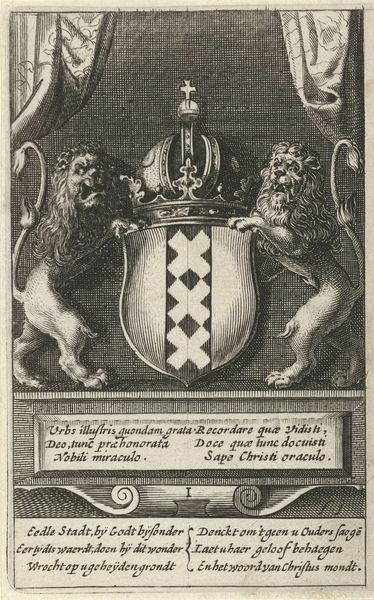 Editor: Here we have an anonymous artwork called "Coat-of-Arms, with two unicorns." I’m really intrigued by how the artist uses line to create such detail. How would you begin to unpack the visual composition here? Curator: The heraldic symmetry is striking, isn’t it? The unicorns, vegetal motifs, and the escutcheon itself are rigorously balanced. Note the artist's mastery of hatching and cross-hatching, building tonal depth from essentially linear means. What effect does this linearity produce for you? Editor: It feels very precise, almost scientific. It gives the image a strong sense of order. Curator: Precisely. The linearity and symmetry create a sense of formality befitting its subject. The interplay of positive and negative space further articulates the design. What have you learned from this piece? Editor: I’ve gained a deeper understanding of how formal elements can convey specific meanings and create a unique visual language. Curator: And I am reminded of the enduring power of visual balance and intricate detail.