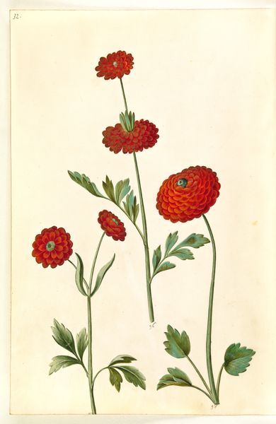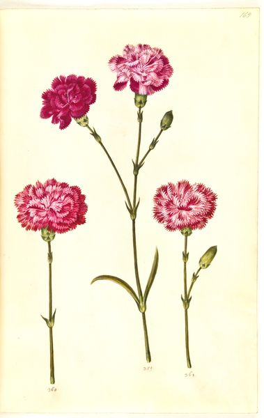 Curator: These painted botanical studies by Hans Simon Holtzbecker from sometime between 1635 and 1664 present two specimens against a blank canvas: Silene chalcedonica, or brændende kærlighed in Danish, and Dianthus barbatus, the studenter-nellike. Editor: Well, hello there, you fiery burst of petals! At first glance, that scarlet bloom just pops—almost aggressively cheerful against the muted background. And beside it, that more demure, lilac blossom offers such a contrast, like a quiet sigh of relief. Curator: These weren't just aesthetic exercises; these botanical drawings emerged during a period where the intersection of art and natural science flourished. Aristocrats collected specimens in cabinets of curiosity, and scientific illustration was booming. These flowers represent wealth, privilege, the power to collect and classify. Editor: Fascinating. I do love thinking of someone painstakingly recreating every vein in those leaves. The detail is lovely! Though, that stiff formality also kind of amuses me. Like nature pressed into behaving. You almost feel like you're viewing the botanical equivalent of a formal court portrait, don't you? Curator: Precisely. The painting, done with gouache and watercolor, is meticulously rendered. These were studies, perhaps for a larger work or to be part of a codex. We have to consider the role of Holtzbecker too: he was not just recording nature but shaping it, selecting these particular plants and presenting them in this composed manner. What narrative did that choice reinforce about humanity's role as stewards of nature? Editor: And they're quite isolated here. Each element feels chosen, meaningful... even if I am not sure I could explain the significance. I think that’s why art like this can keep speaking through centuries: we still bring ourselves, our contexts to it. Curator: I agree. There’s always more to excavate beyond the surface-level beauty, cultural power at play in our relationship with the environment. Editor: A potent combination of the beautiful and the meaningful…that's always stuck with me after encounters with works like this. Thanks for chatting!