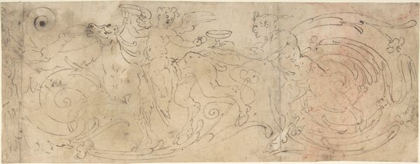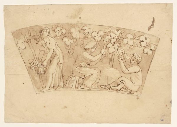 Curator: Rodolphe Bresdin's "Israelites with Grapes from the Promised Land" depicts a scene of abundance, a visual testament to a divinely promised future. What’s your immediate reaction? Editor: It feels…oppressive. The grapes are so oversized, the figures seem burdened, almost enslaved by this promised bounty. Curator: That's a fascinating read, considering the biblical context. The grapes represent the fertility of Canaan, yet Bresdin’s treatment hints at the complex dynamic of promised lands and the labor they demand. Editor: Absolutely. The grape, symbolically rich, evokes sacrifice and celebration. But here, the stark linework and strained postures undermine any sense of triumph, instead pointing towards a critical perspective on the myth itself. Curator: It makes you wonder about Bresdin’s intentions. Perhaps a commentary on the cost of such promises? Editor: Perhaps. It certainly moves beyond a simple illustration, forcing us to confront the ambiguous nature of "deliverance." Curator: Food for thought, indeed. Editor: Definitely a lot to chew on.
